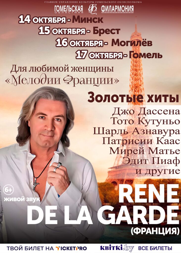 14, 15, 16 и 17 октября в четырёх городах Беларуси выступит французский певец, поэт и композитор Rene De La Garde. К любимому празднику – Дню матери – артист представит романтическую программу «Мелодии Франции».