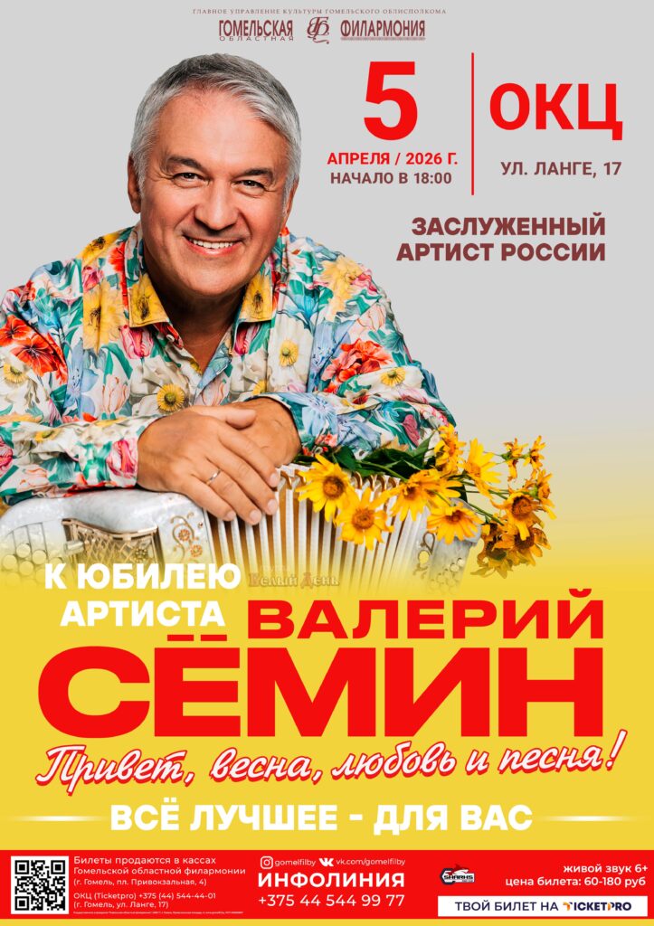 5 апреля с большим юбилейным концертом в Гомеле выступит легенда российской народной культуры: харизматичный баянист, композитор – Заслуженный артист России Валерий Сёмин.